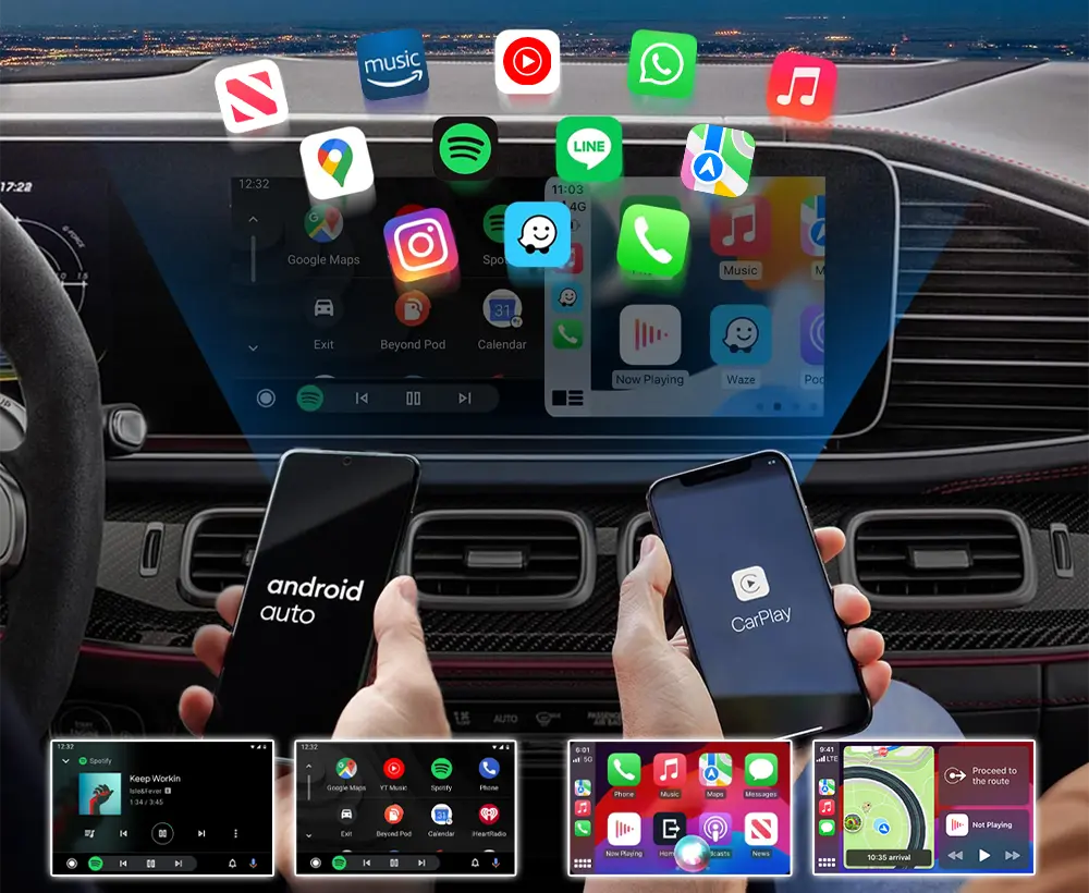 This aftermarket interface integrates with your original display, letting you switch seamlessly between the original car system and Apple CarPlay/Android Auto. Enjoy easy access to apps like Google Maps, Spotify, YouTube, WhatsApp, Pandora, and more.